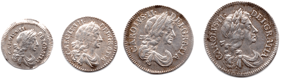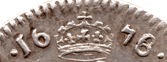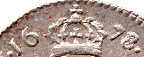 1678 Maundy set - Charles II 4d - EF? Date Very clear 6 over 8 (struck in 1678 but the 8 was not punched hard enough !) 3d - VF+-EF? 2d - EF? Several fine 'haymarking' lines on both side' Date The 8 appears to have been overstruck on multiple dates ?? 8 over 3 (the curved top and tail of the 3 showing !?) 8 over 6 (the upward tail of the 6 showing in the top circular part of the 8 !?) 8 over 7 (the back of the top bar of the 7 shows to the right of the top circular part of the 8 and the down bar follows the downward part and is clearly seen in the lower circular part of the 8 !?) 1d - EF? Struck on a slightly spread flan (without a collar !?) A slightly rusty die ? A nicely matched set EF? Brightish Very Scarce. * The over-strike of the 8 of the twopence on possibly so many other dates is fascinating and very unusual.