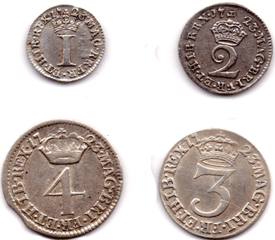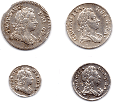 1723 Maundy set - George I 4d - VF+ Very slightly clipped at 10-11 o'clock - where the coin was not properly ejected when the next coin was to be struck. 3d - VF+ V of GEORGIVS double struck 2d - VF+-EF? Tiny 'haymarking' flecks 1d - VF+ Also a few 'haymarking' flecks A nicely matched set that is probably VF+ overall. Brightish Very Scarce.